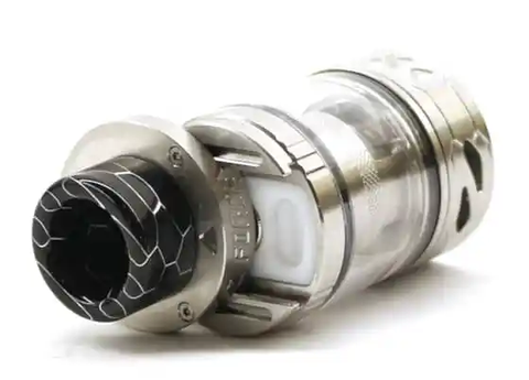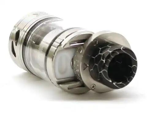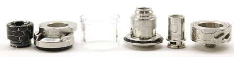 A color matched wide bore resin 810 removable drip tip securely fits into the top cap with 2 O-Rings ensuring it’s a very secure fit providing a DTL and RDL style vaping draw.