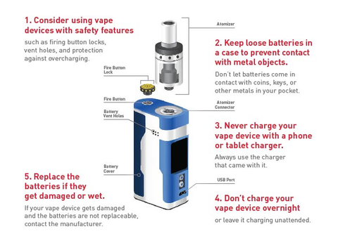 You may have heard that e-cigarettes, or "vapes," can explode and seriously injure people. Although they appear rare, these explosions are dangerous. The exact causes of such incidents are not yet clear, but some evidence suggests that battery-related issues may lead to vape explosions. The safety tips below may help you avoid a vape battery explosion. Please report a vape explosion or any other undesired health or quality problems with a vape to the FDA.